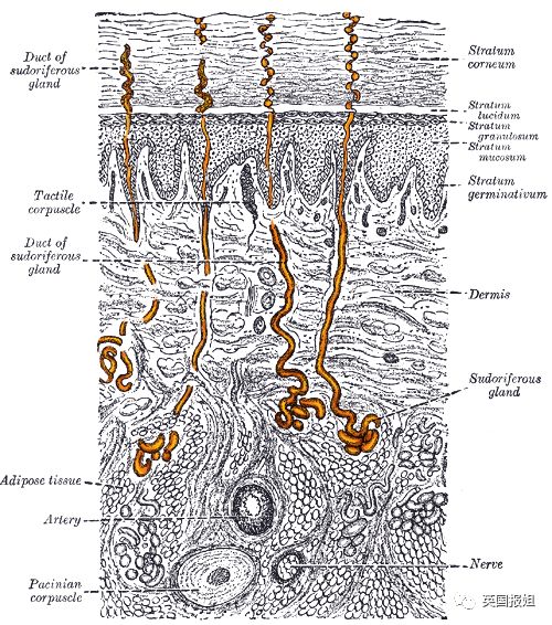 汗腺,分为大汗腺与小汗腺。是哺乳动物皮肤的真皮层、皮下组织中分泌汗液的腺。