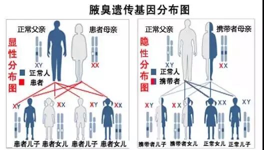 我们知道,人体一共有23对染色体,问题出在第16对染色体长臂的一个基因上,这个基因的一个小的变异导致了人体大汗腺的分泌功能异常强大,把普通人不能分泌的一些大分子的有机物分泌了出来。而身体表面的细菌得到了这些有营养的大分子物质,就进行繁殖和分解,产生了很多有特殊刺激性臭味的物质,就是腋臭。这个基因的遗传特点是常染色体显性遗传,通俗讲就是父母一方患有腋臭会有50%几率遗传给子女,与性别没有关系。极个别的情况下有的人没有遗传史,考虑可能为基因突变所致。