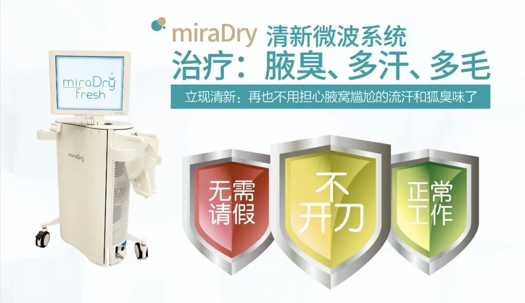 miraDry清新微波运用专利微波热能聚焦科技,采用非侵入性的治疗方式,将能量集中传递至真皮层和脂肪层的交界处。大、小汗腺聚集的区域,并在汗腺位置形成集中加热区。通过准确控制标靶微波热能,持久性破坏腋下大小汗腺且不再新生,同时破坏与大汗腺连接毛囊。一举三得实现腋下止汗、祛腋臭、褪腋毛的效果。