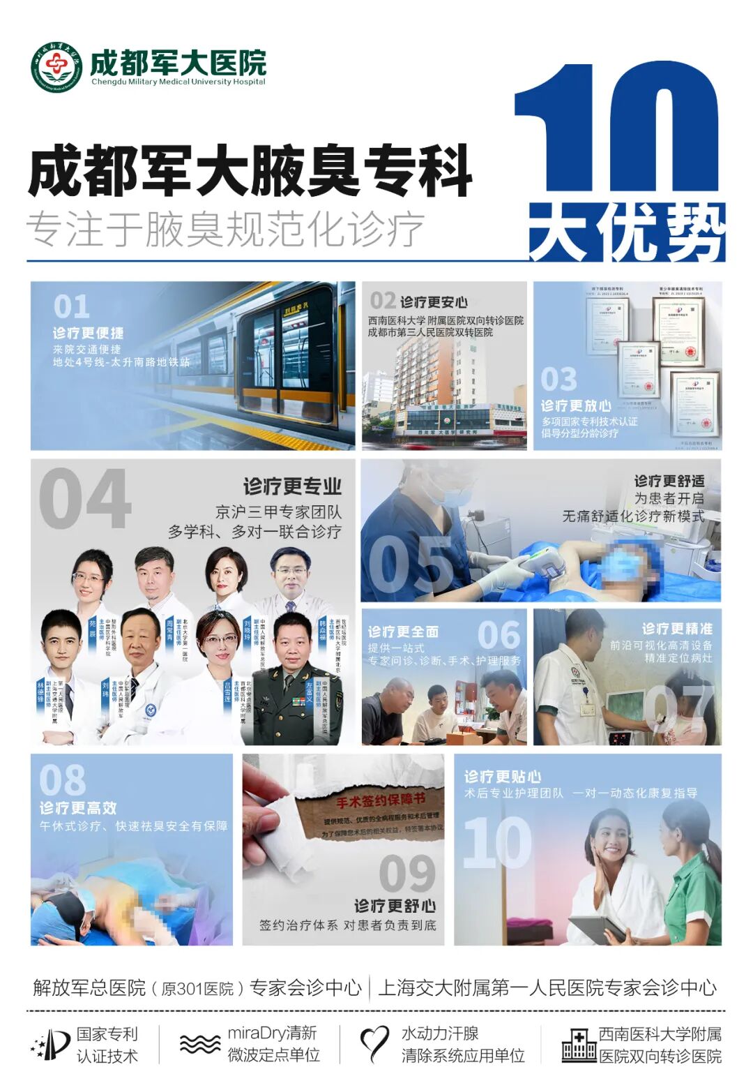 成都军大医院腋臭科致力于腋臭病种的专业、专病、专治。遵循分龄分型立体化现代诊疗模式,开设男性腋臭、女性腋臭、青春期腋臭等特色门诊,为腋臭患者提供全面、专业、可靠的诊疗服务。成都军大医院不断拓展国内优质医疗资源,不定期邀请上海、北京等三甲名医来院会诊,通过多学科联合会诊形式,打破传统单一诊疗,让患者看病少走弯路,享受一站式服务。