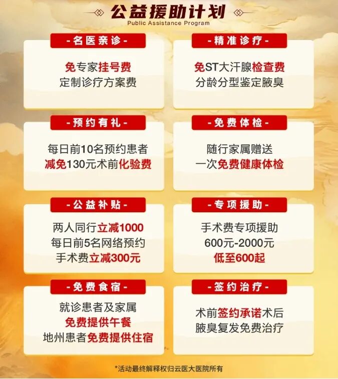 好消息!新一代3D腋臭根治技术评审会在我院隆重举行,特推出8大公益援助计划。扫描下方二维码,即可报名活动。每日仅限前10个名额,请务必提前预约。昆明云医大腋臭医院,助你清新自信迎接崭新的生活。