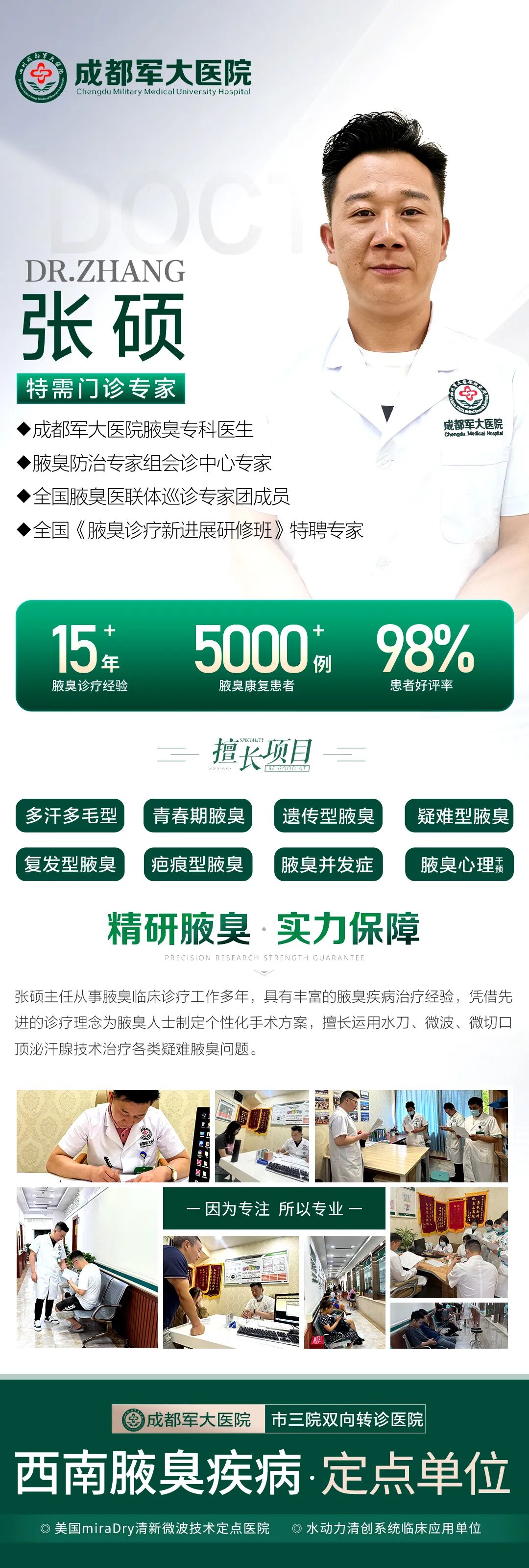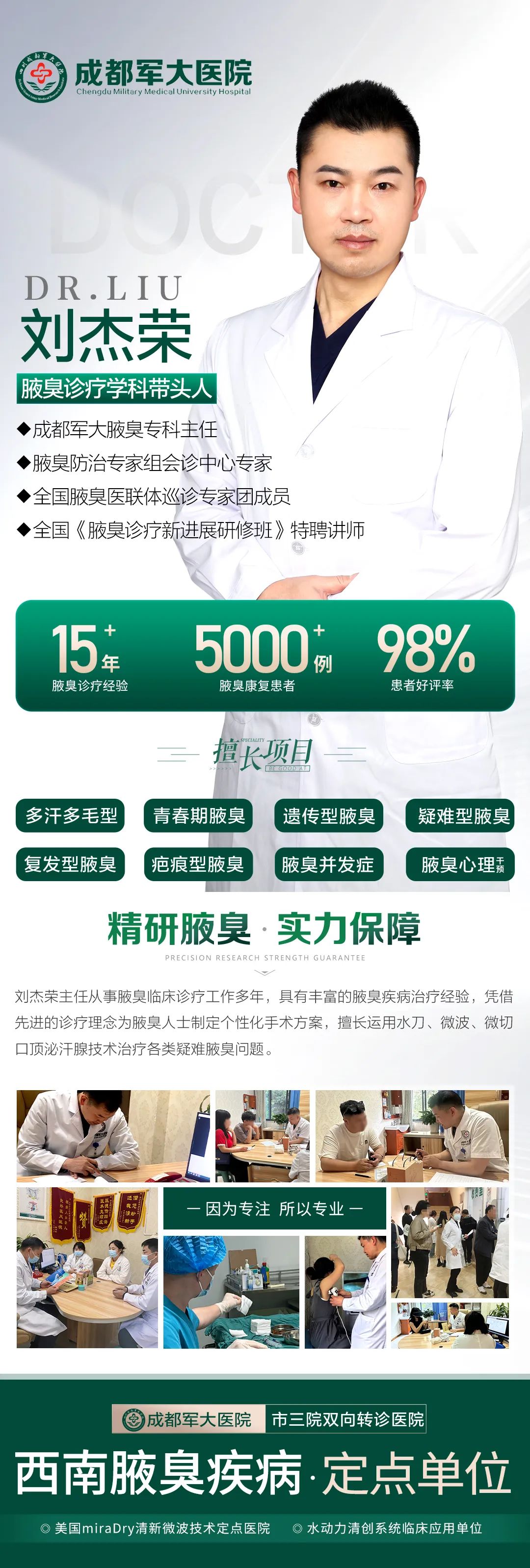 成都军大医院腋臭科拥有经验丰富的专家团队,整合优势医疗资源,发挥医生专业优势,开设男性腋臭、女性腋臭、青春期腋臭、遗传型腋臭、复发型腋臭等特色门诊,为腋臭患者提供全面、专业、可靠的诊疗服务,推行腋臭多学科医生联合会诊模式,分析检查报告,制定个体化组合治疗方案。