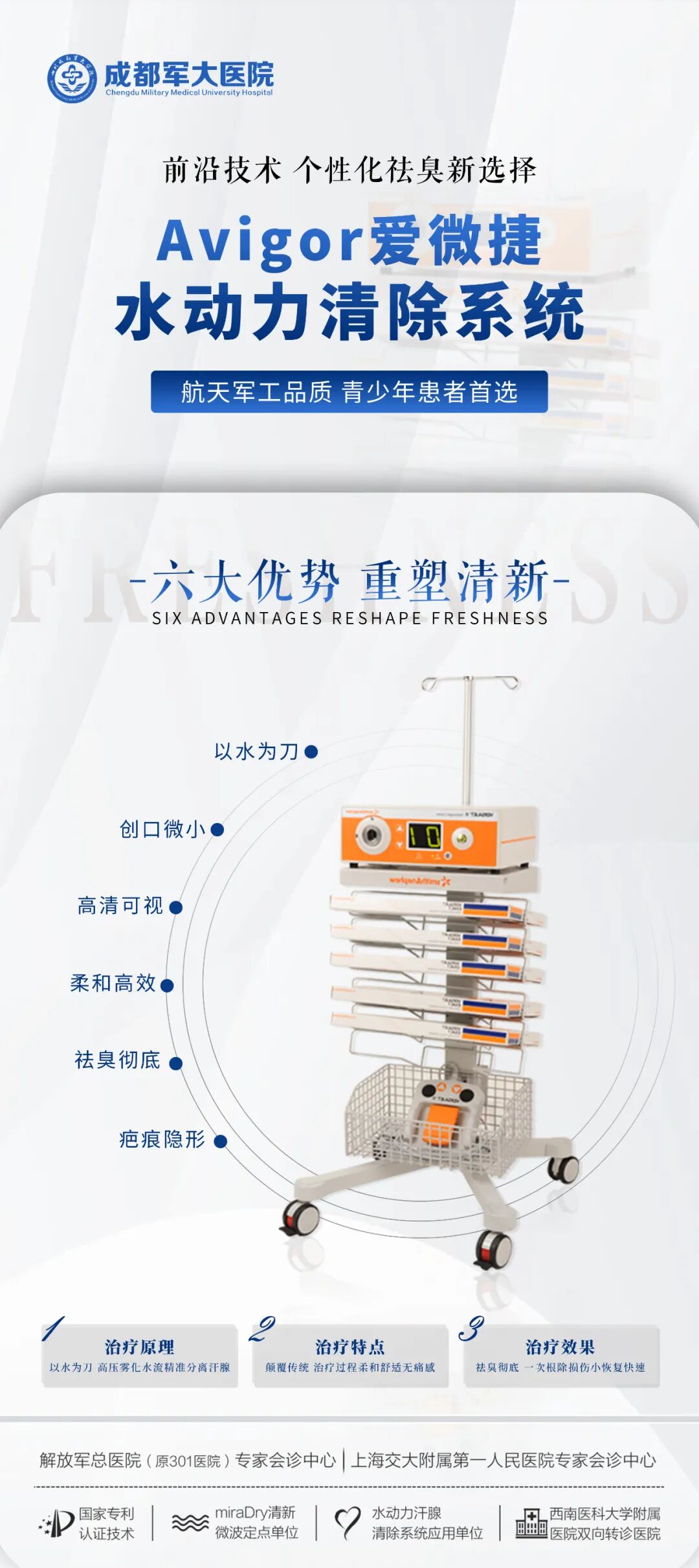 医院引进国内外先进的诊疗技术设备,专科专治更专业。腋臭科引进miraDry清新微波、水动力清除系统等腋臭技术,为腋臭科学治疗提供了强有力的设备硬件保障。