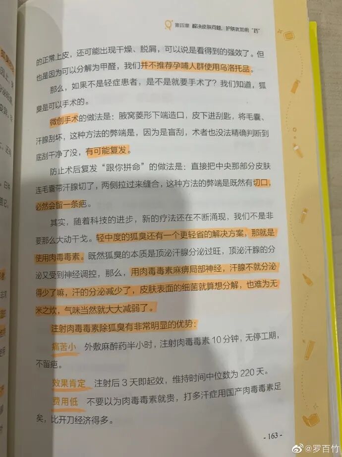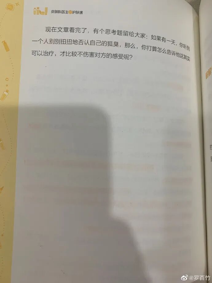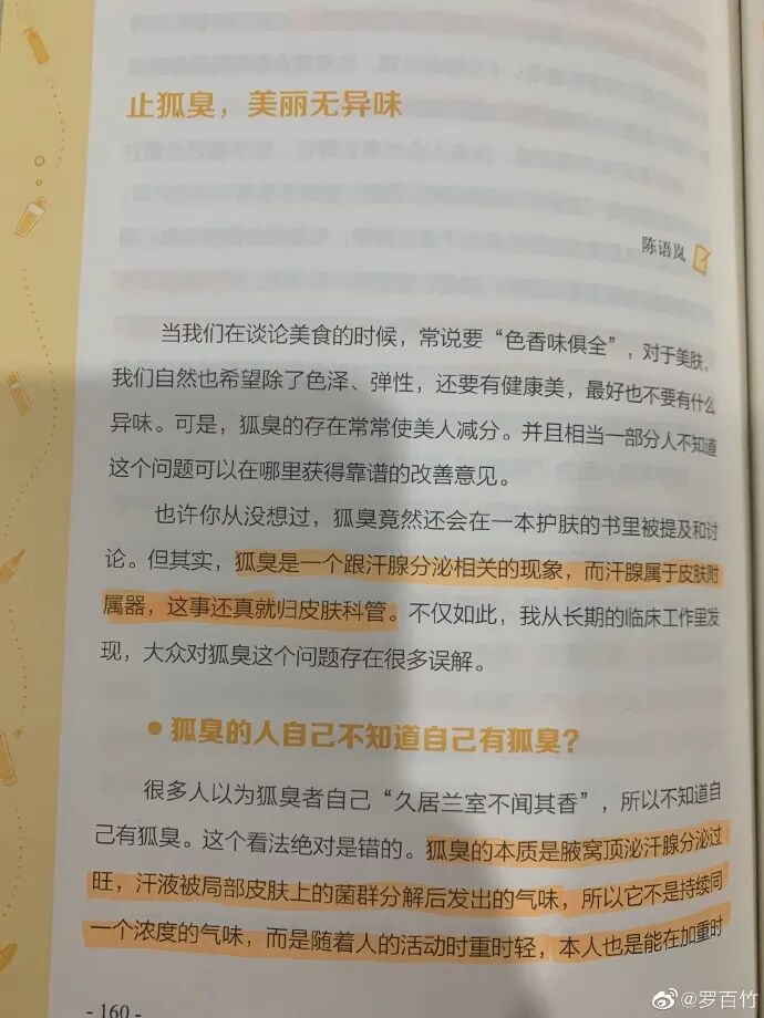 @罗百竹:皮肤科医生的护肤课 止狐臭,美丽无异味!长见识了,今天第一次知道狐臭可以通过注射肉毒毒素来治疗!谢谢@皮科匠陈语岚 医生的科普。最后陈医生提的问题,我觉得男生之间可能就当不知道。问了下童妈,童妈说:可以说自己或自己的亲闺蜜有这个困扰,通过什么方法解决了,然后把陈医生的科谱介绍给对方。如果是自己的亲闺蜜,会大大方方买点止汗产品,大大方方和对方讨论怎么用,也可以一起去看皮肤科医生。