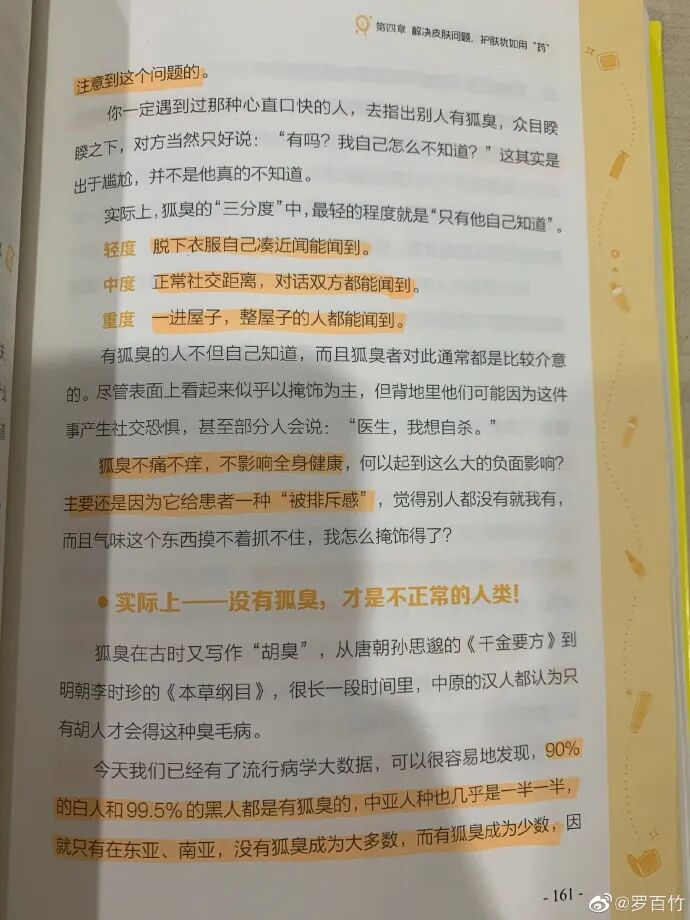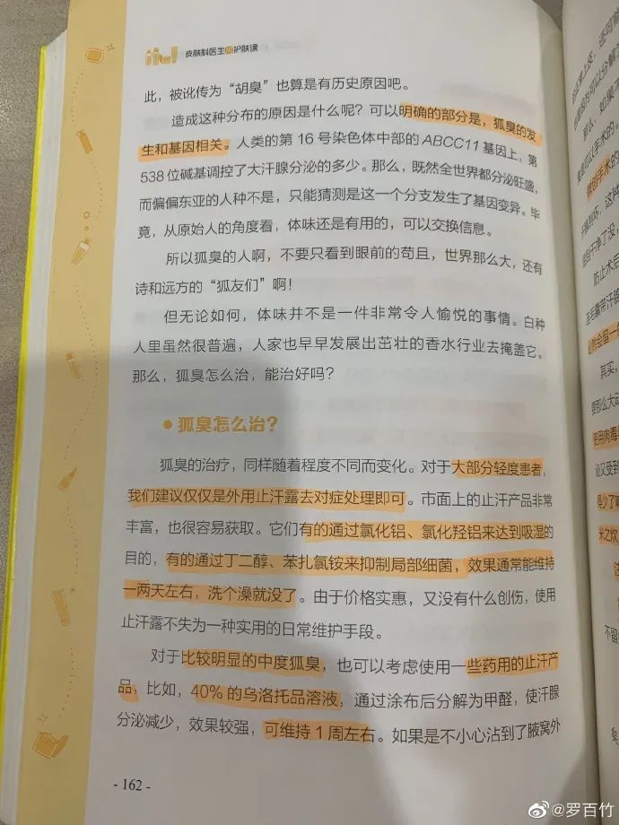 @罗百竹:有腋臭的其实才是正常人,因为大多数没腋臭的人靠的是基因变异。不管有没有腋臭,都是正常的生理现象,该用止汗剂的用止汗剂,想要的手术就去手术。我们不需要因为体味而自卑或者嘲笑别人。腋下出汗和体臭问题在青春期开始出现,大多数儿童可以使用止汗剂处理这个问题。
