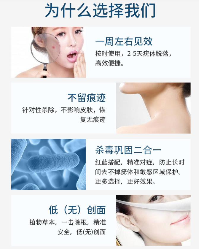 【主治】:❤常见的有寻常疣,👌扁干疣,传染性软疣,尖锐湿疣等,化脓性皮肤疾病剂,狐臭腋臭,🔥🔥皮肤病感染引起的病毒疣皮肤病,伤痕或烫伤,也可以用于粉刺使用。