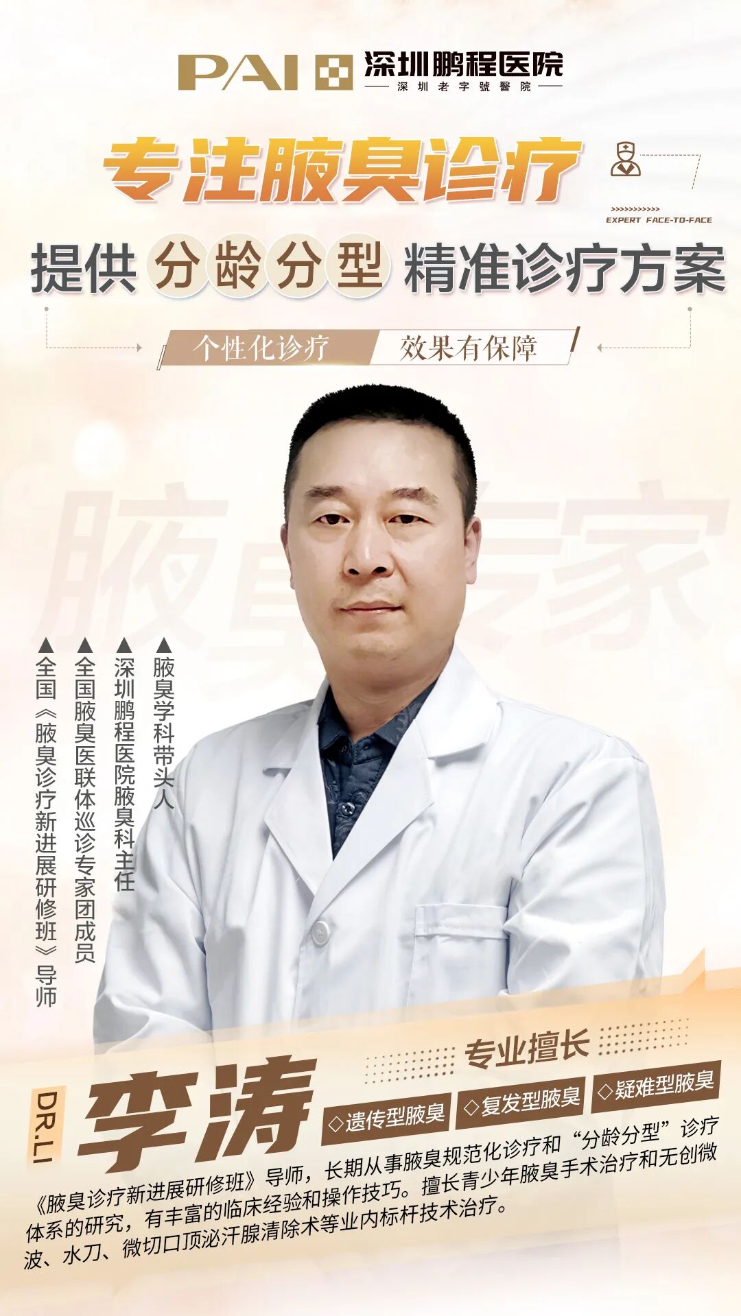 深圳鹏程医院腋臭科主任,全国《腋臭诊疗新进展研修班》导师,从事腋臭临床诊疗和科研工作多年,对多数类型的腋臭有着丰富的治疗经验,曾多次赴北京、上海等地参加学术会议,探究学术发展,在腋臭疾病理论理论研究方面造诣颇深,形成了一套完整系统的腋臭治疗体系。