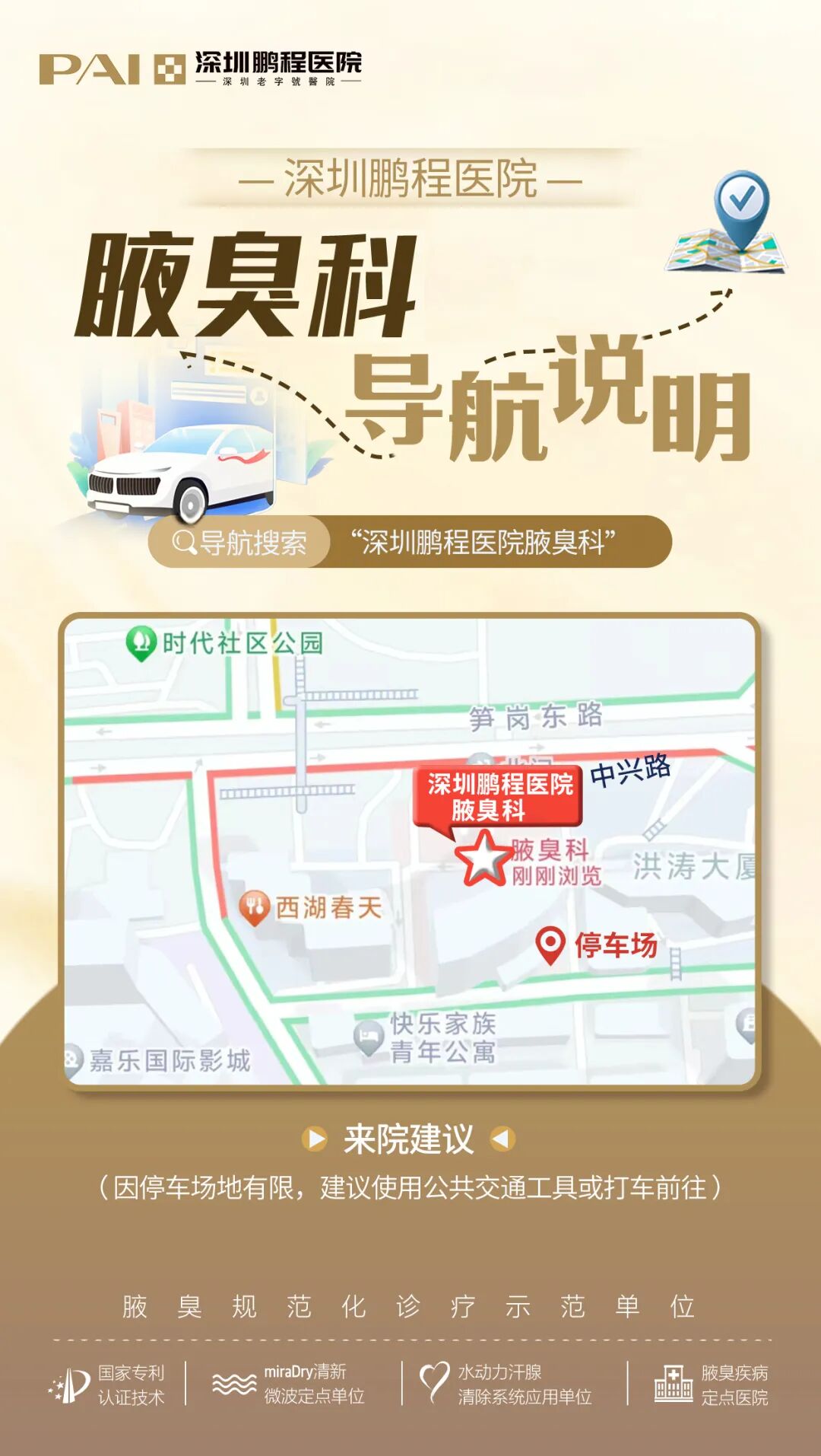 深圳鹏程医院地址位于深圳市罗湖区笋岗东路3013号1-4楼长虹大厦。腋臭科作为院内专注腋臭诊疗的特色科室,一直遵循分型分龄个性化诊疗模式,针对患者类型开展多学科精细化问诊,科学系统化检查,为患者制定科学、规范、安全的祛臭方案,让患者看病少走弯路,享受一站式诊疗服务。
