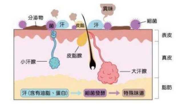 人体大约有330多万个汗腺,其中小汗腺占90%,大汗腺占10%。小汗腺分泌的汗液通常没有气味;而大汗腺的分泌物比较粘稠,其中夹带了各种蛋白质和脂肪酸,但其本身也是不臭的,主要原因是分泌物被表面的细菌分解后生成各种不饱和脂肪酸,才会散发出臭味。