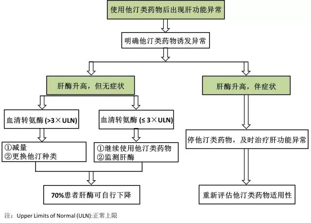 FDA已得出结论,他汀类药物相关严重肝损伤罕见且不可预知。此外,常规的监测尚不能有效地检测或预防严重的肝损伤,因此,不推荐使用他汀类药物后进行常规的肝功能监测。但与欧美国家不同,中国约有2000万人患有慢性乙型肝炎,因此我们仍需关注他汀类药物的肝脏安全:起始他汀类药物治疗前,监测肝功能水平。对用药前存在肝功能异常的患者,应查明原因,评估他汀类药物的适用性。用药过程中出现肝功能异常,可按以下流程处理: