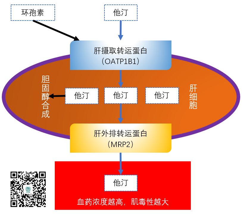 他汀类药物,通过肝摄取转运蛋白(OATP1B1)进入肝细胞,抑制胆固醇合成。环孢素对OATP1B1有抑制作用,升高他汀类的血药浓度,增加肌病发生率。