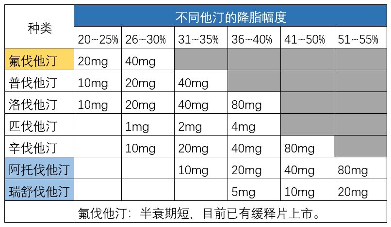 在选择他汀品种时,不需考虑患者低密度胆固醇(LDL-C)的绝对值,只需根据降脂幅度,选择具体品种(见下表)。