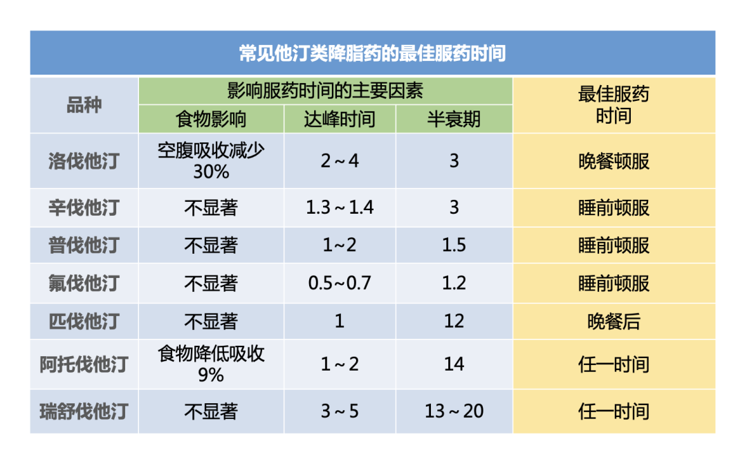 他汀类药物由于受达峰时间,半衰期,食物等因素影响,不同他汀类药物的最佳服药时间有所不同。