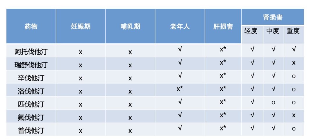 √ 表示正常使用;× 表示禁止使用;○ 表示谨慎使用,需医师充分权衡利弊并仔细阅读药品说明书;* 表示活动性肝病、失代偿性肝硬化及急性肝衰竭、不明原因转氨酶持续升高(≥ 3 倍正常值上限)时禁用