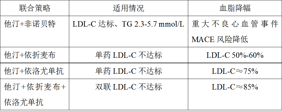 降脂药物的联合应用是血脂异常干预策略的基本趋势,主要目的是提高血脂达标率,进一步降低ASCVD风险,减少降脂药物的不良反应率。
