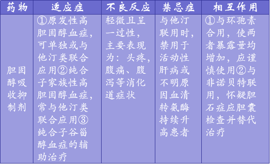 胆固醇吸收抑制剂,包括依折麦布和海博麦布,它通过抑制小肠对胆固醇吸收来减少血液中胆固醇水平,可降低LDL-C 15%-22%,对甘油三酯和HDL-C的影响可忽略。其安全性和耐受性良好,轻度肝功能不全或轻至重度肾功能不全患者均无须调整剂量。