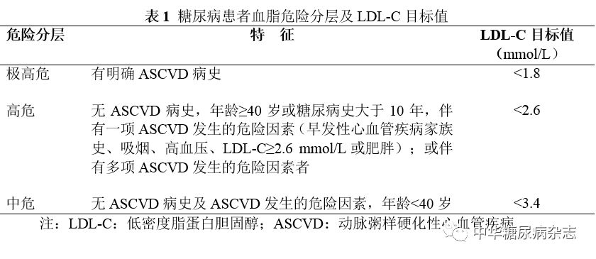 根据危险因素分层进行降脂治疗是当前血脂管理的趋势。因此,糖尿病患者同样需要根据危险分层进行调脂治疗(表1),一般应采取中等强度他汀治疗。