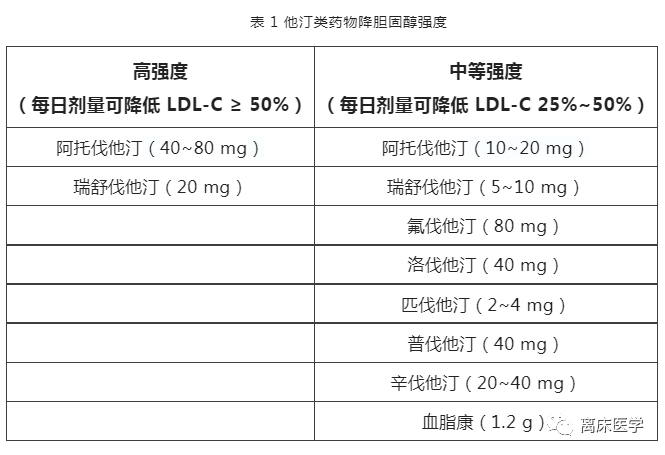 他汀类药物使用剂量不同,其降胆固醇强度也不同。2016 年《中国成人血脂异常防治指南》推荐,按照降低低密度脂蛋白胆固醇(LDL-C)的强度,将他汀类药物分为中等强度他汀和高强度他汀。