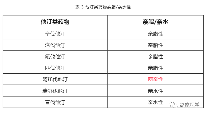 他汀类药物亲脂性顺序依次为:普伐他汀 < 瑞舒伐他汀 < 阿托伐他汀 < 氟伐他汀 < 匹伐他汀 < 洛伐他汀 < 辛伐他汀。