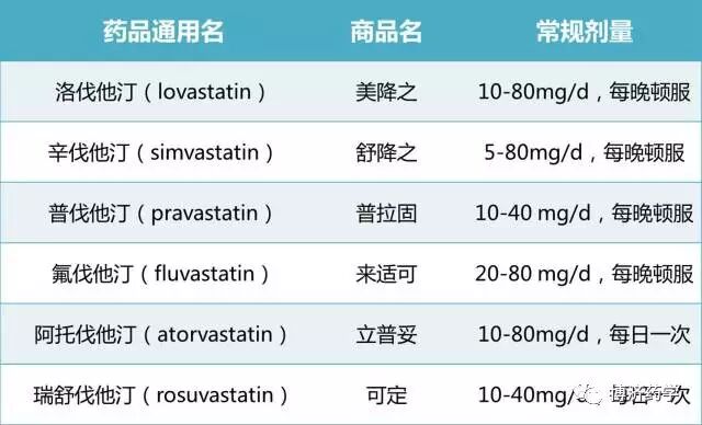 他汀类药物是一类具有萘酯环骨架结构的羟甲戊二酰辅酶A还原酶抑制剂,具有良好的降血脂及心血管保护作用,是目前使用最广泛的治疗和预防高血脂的药物。其主要的代表药物以及常规剂量如下表所示: