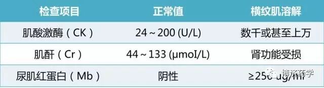 3、横纹肌溶解:肌肉有明显疼痛症状,肌酸激酶(CK)水平大幅上升(往往高于正常值10倍以上),并且可能伴有肌肉组织内其他酶类含量水平的升高,常有褐色尿或肌红蛋白尿。横纹肌溶解症相关检查项目以及对应的指标如下表所示: