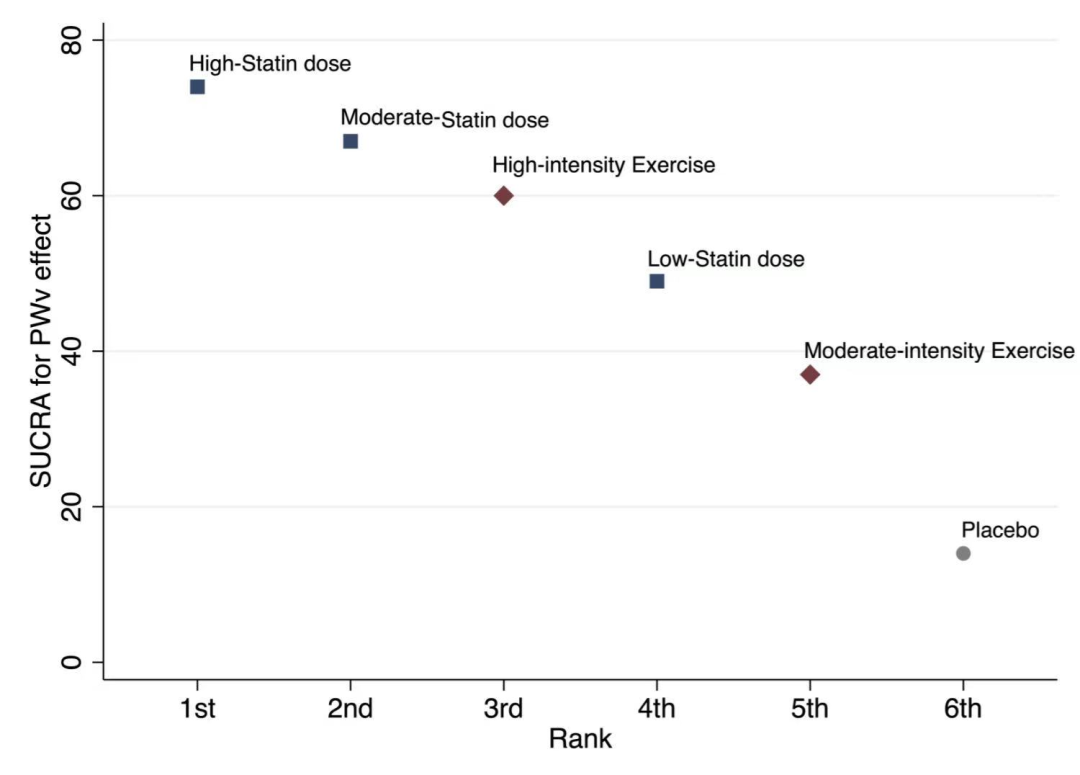 结果显示,他汀和体育锻炼研究的患者总数相似,分别为587名和720名。体育锻炼干预组的参与者的心脏代谢风险基线低于他汀类药物干预组。使用3种他汀类药物剂量和2种强度的体育锻炼对动脉僵硬度的影响,中度他汀类药物剂量和高强度运动似乎更为有效。他汀类药物的高剂量显示较高的SUCRA(74%)。中度他汀类药物剂量和高强度运动显示出第二和第三高的累积排序曲线下的面积(SUCRA)分别为67%和60%。