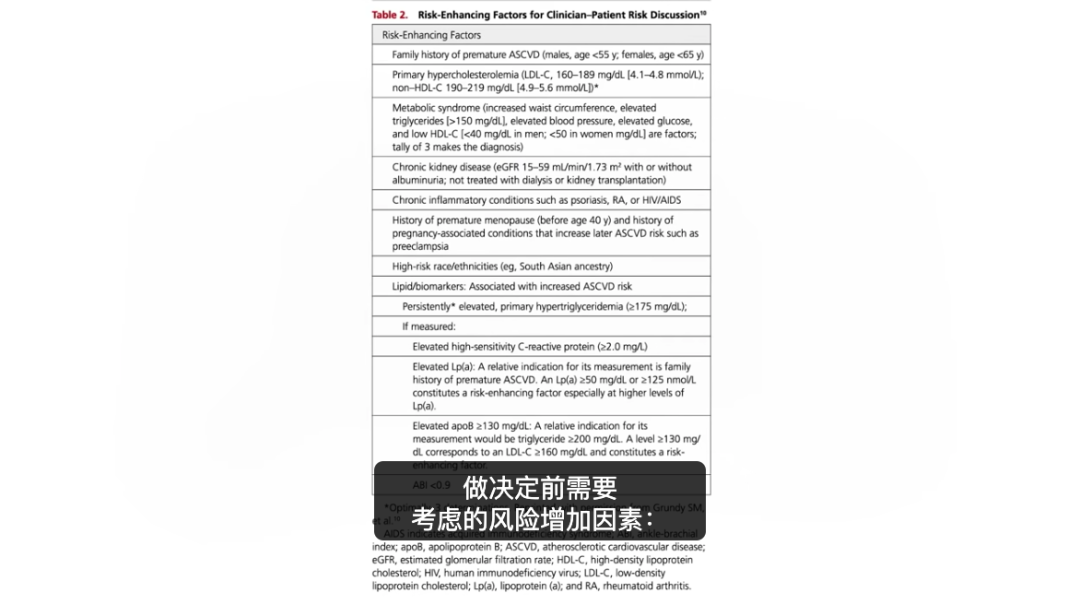 这是一系列在你的医生帮你做决定前,需要考虑的风险增加因素:家族病史、极高的LDL、代谢综合征、慢性肾脏疾病或炎症、持续很高的甘油三酯或C-反应蛋白,或LP(a)指数。