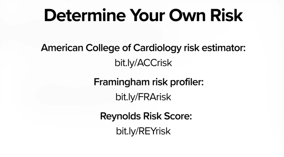 如果你知道自己的胆固醇和血压数字,你可以轻易通过美国心脏病风险评估学院、弗雷明汉风险分析器,或雷诺兹风险评分测算。