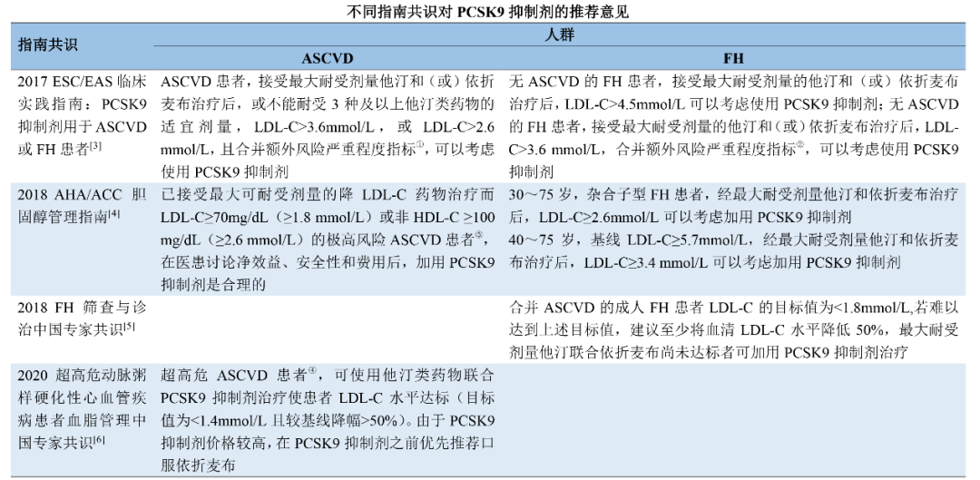 目前国内外多个指南共识对于PCSK9抑制剂的使用给予了推荐意见。各指南共识对于推荐人群和起始治疗阈值略有差别,但主要应用人群包括ASCVD和FH,详见下表。
