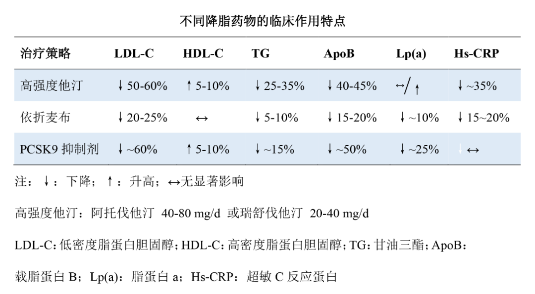 不同调脂药物的临床作用特点见下表[2],但这些指标能否造成临床结局的差异目前仍无定论。