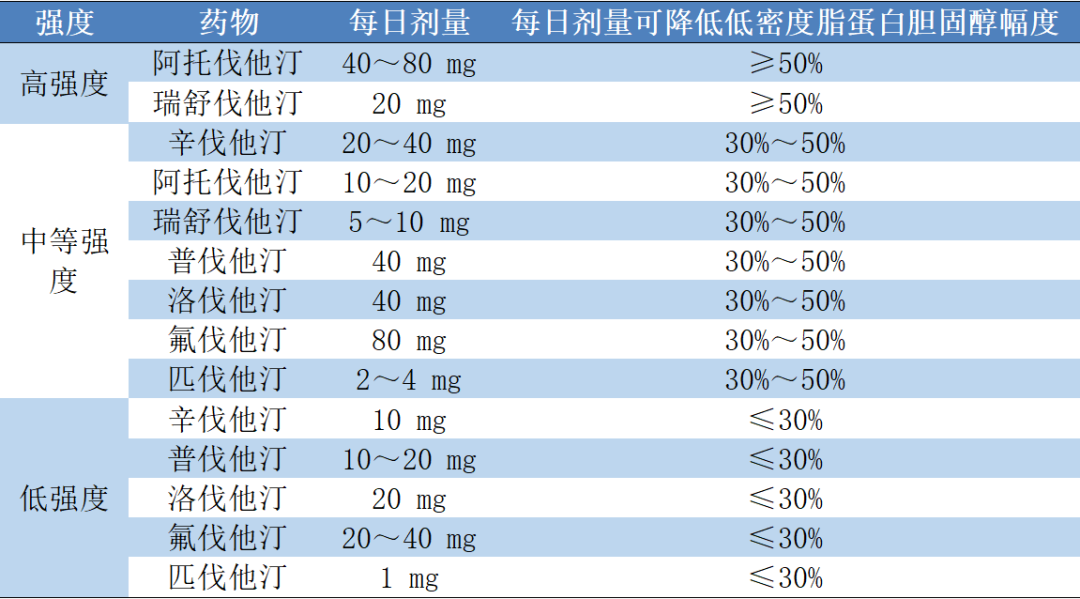 表1 不同作用强度的他汀类药物种类及剂量