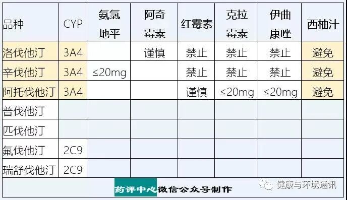 瑞舒伐他汀经CYP2C9发生少量的代谢,药物相互作用较少。匹伐他汀和普伐他汀不经细胞色素CYP3A4和2C9代谢,相互作用也较少。洛伐他汀、辛伐他汀和阿托伐他汀主要经CYP3A4代谢,应避免与胺碘酮、维拉帕米、地尔硫卓、伊曲康唑、泊沙康唑、伏立康唑、克拉霉素、红霉素、泰利霉素、环孢素等CYP3A4抑制剂合用。氟伐他汀主要通过CYP2C9代谢,而且对CYP2C9有抑制作用,应避免与氟康唑等CYP2C9抑制剂合用。