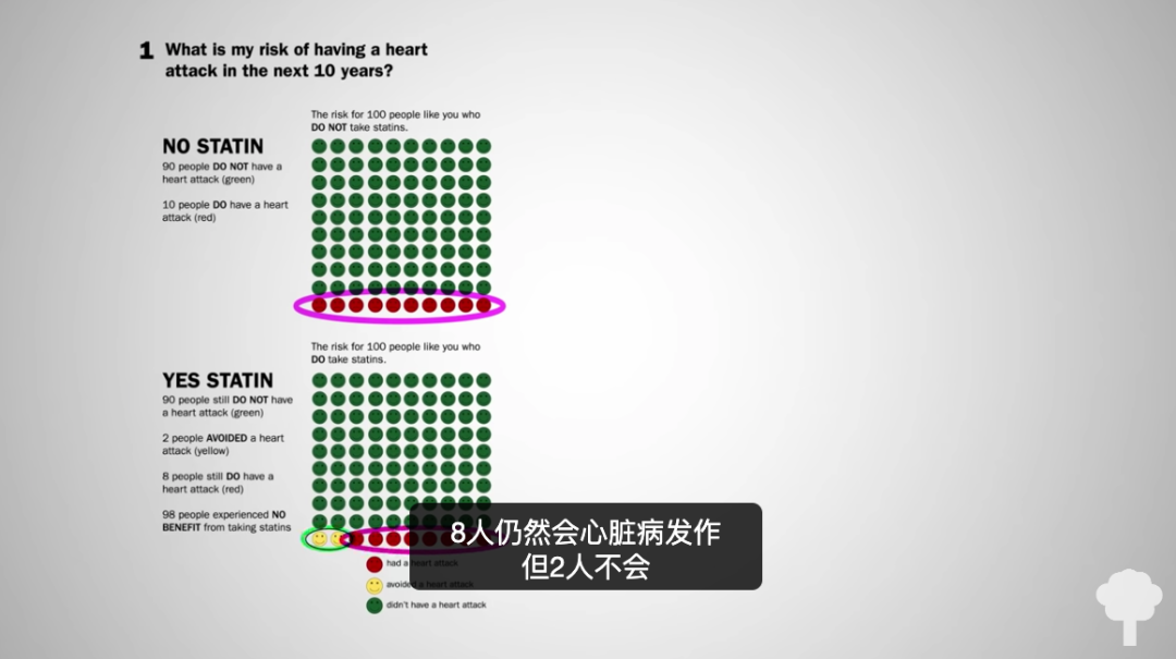 对于那些考虑使用他汀类药物的平均风险人群,在接下来的10年里,如果这100人在这10年里每天都服用他汀类药物,8人仍然会心脏病发作,但2人不会。