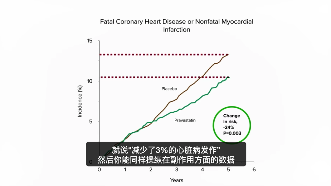 如果你想让他汀类药物听起来效果差,你会使用绝对风险降低值,就说减少了3%的心脏病发作。