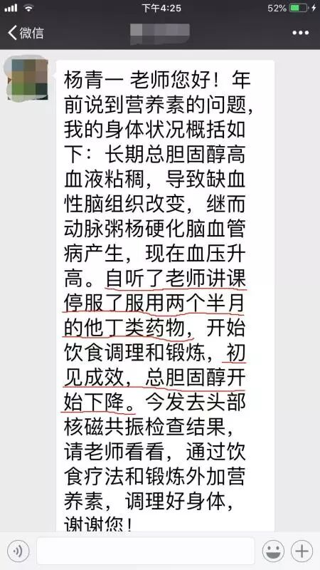 很多听众收听《青说健康》,阅读我的新书《分享》后,进行食疗调理尝试停服他汀药物,取得了好的效果,前几天有位听众给我发来微信,停服他汀后同时按照杨老师教给的食疗调理方法实施,两个半月后胆固醇开始下降,看到这个结果我非常高兴,大家可以在公众号中看一下听众的健康分享。