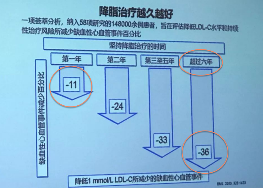 一项荟萃分析发现,坚持服用降脂药物1年后,LDL-C每降低1mmol/L,发生缺血性心血管事件风险降低11%,2年后降低24%,超过6年降低36%。