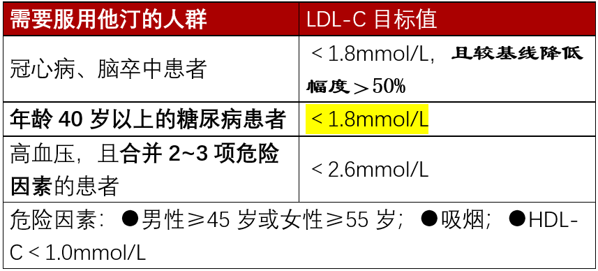 凡是低密度脂蛋白胆固醇(LDL-C)水平超过目标值的人群,若无禁忌症和可耐受,都应该服用他汀类药物(见下表)。需要提醒的是: