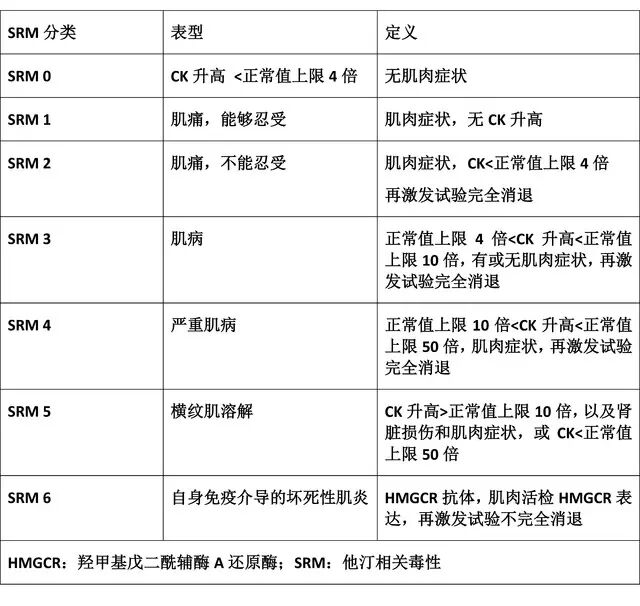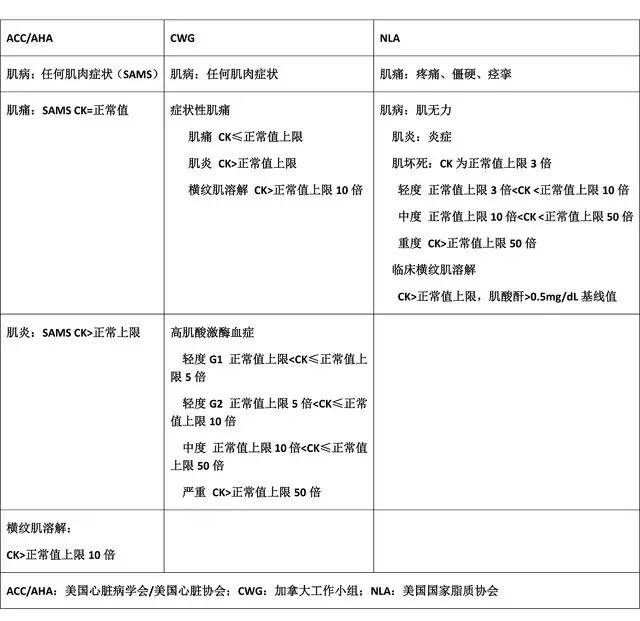 定义:CK 比正常值上限高 10 倍,且没有其它原因导致的肌肉损伤。更为权威的诊断标准为类似的 CK 升高以及肾功能损伤。然而,他汀治疗期间,并不是所有的情况下 CK 显著升高都提示横纹肌溶解,如一些没有接受他汀治疗的 CK 水平长期升高患者或特发性高 CK 血症患者。因此,他汀治疗前是否需要测定基线 CK 水平存在争议。