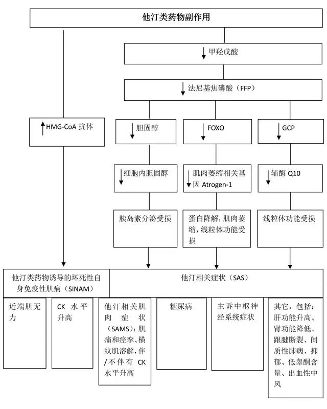 他汀类药物能够抑制甲羟戊酸途径限速酶 HMG-CoA 还原酶的活性,从而减少胆固醇、法尼基焦磷酸(FFP)和香叶基焦磷酸(GCPP)的生成。他汀类药物引起 SAMS 的可能机制包括:减少细胞膜或 T 小管胆固醇;激活磷脂酰肌醇 3 激酶(PI3K)/Akt 信号通路导致肌肉肥厚(激活 mTOR)或肌肉萎缩(激活叉头盒蛋白 O FOXO);损伤线粒体功能。