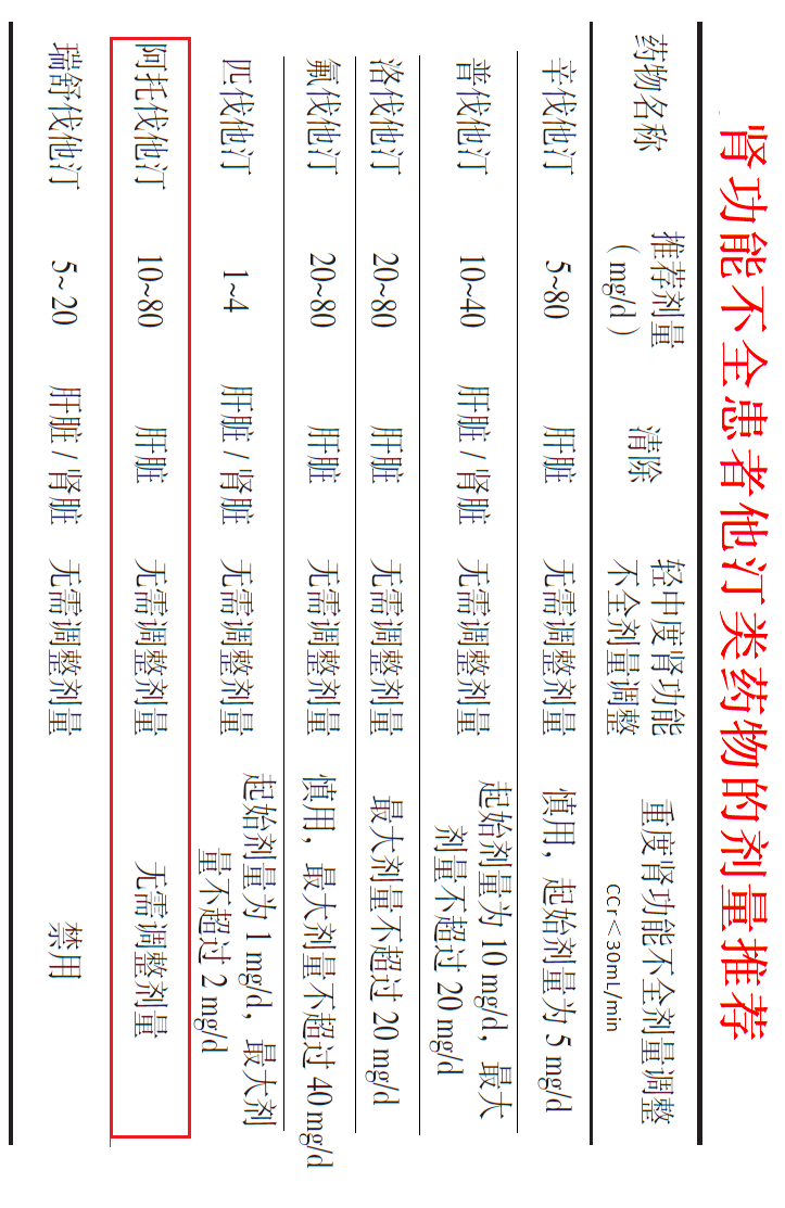 8、肾功能不全患者他汀类药物的剂量推荐:他汀类药物一般无肾脏损伤作用,在起始治疗时应选用中等强度的他汀,根据患者疗效及耐受情况进行剂量调整。随着肾功能下降,他汀类药物的清除能力下降;慢性肾脏疾病(CKD)是他汀类药物引起肌病的高危因素,应根据肾功能水平进行药物选择和剂量调整。CKD G1~2期患者使用他汀类药物无需调整剂量;CKD G3 期患者使用普伐他汀应减量;CKD G4~5期患者使用辛伐他汀须减量,禁用氟伐他汀和瑞舒伐他汀。阿托伐他汀及其代谢产物主要经肝脏和(或)肝外代谢后经胆汁清除,DKD 患者使用时无需调整剂量。