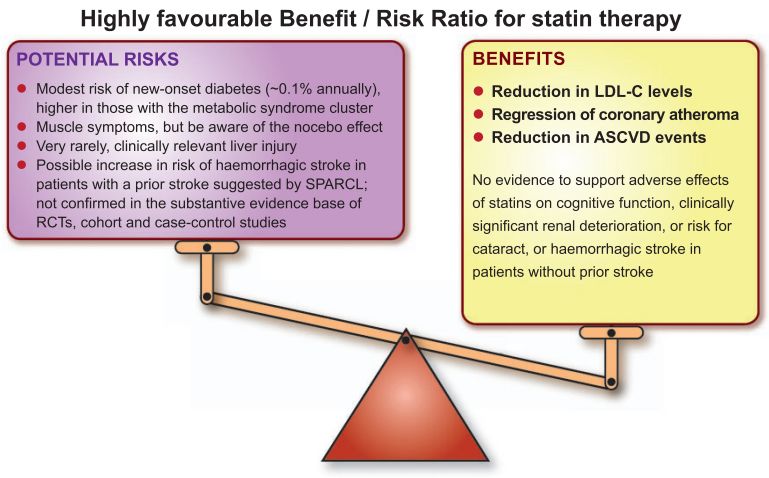 长期他汀治疗的心血管获益远远超过潜在的风险。欧洲动脉粥样硬化学会共识组指出,公众对他汀类药物不良反应担忧太过了,部分是由于媒体的报道。事实上,他汀类药物治疗非常安全。