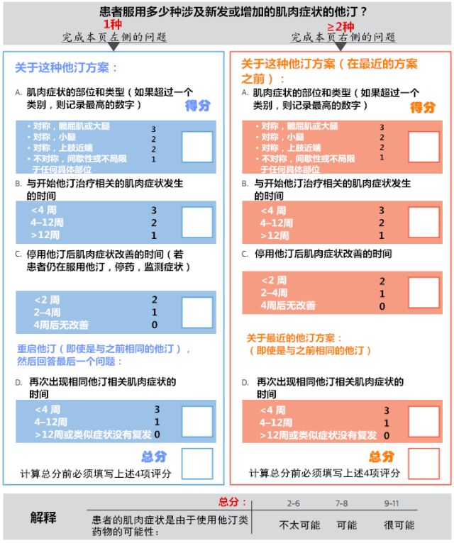 当他汀类药物或有相互作用的药物停用后,患者升高的CK降低,或当停用他汀类药物几周内患者症状明显消失和(或)药物重新使用的1个月内症状再发,则SAMS更可能是由他汀类药物引起。症状再次出现的时间也受到他汀类药物剂量和再次使用持续时间的影响。至少试用2种他汀,更能明确诊断SAMS。