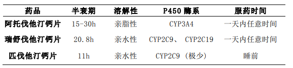 阿托伐他汀主要经CYP3A4酶代谢,与CYP3A4强抑制剂(克拉霉素、红霉素、伊曲康唑等)联合用药,引发安全性风险,需谨慎联用。葡萄柚汁同样也会对CYP3A4酶形成影响,因此服用阿托伐他汀时也要尽量避免饮用;而匹伐他汀钙片和瑞舒伐他汀钙片几乎不经过CYP3A4酶代谢,因此药物相互作用相对较少,对于联合药物较多的患者来说,选用匹伐他汀钙片和瑞舒伐他汀钙片则是更好的选择。