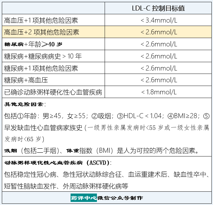 刘某,男,51岁,高血压,无其他疾病史,有吸烟史。刘某至少有2项其他危险因素(男≥45岁,吸烟),LDL-C目标值为<2.6mmol/L。