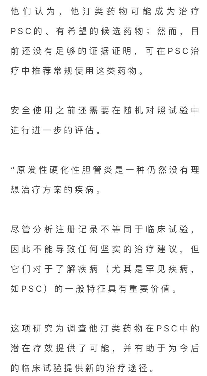 该研究评估了暴露于不同药物(包括他汀类、UDCA、氨基水杨酸盐、抗生素、硫唑嘌呤和糖皮质激素)对PSC患者各种临床结果的影响。