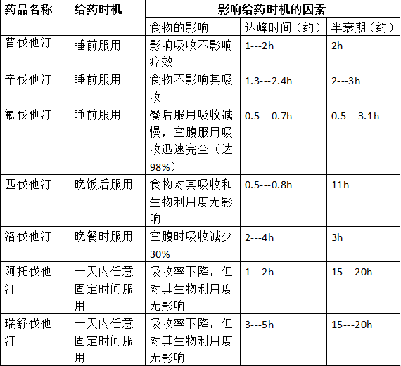 胃肠吸收快,而且半衰期短<3小时,主要通过抑制胆固醇高峰时间的合成发挥降血脂作用。因此,须睡前服用。