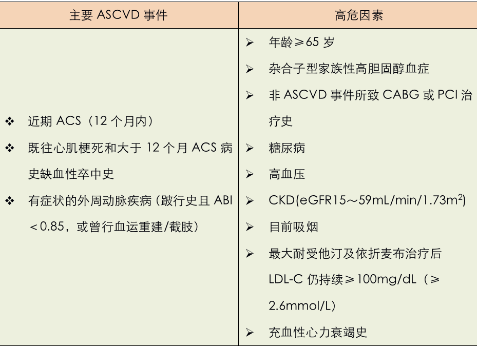 • 极高危 ASCVD 患者(多个主要 ASCVD 事件或 1 个主要 ASCVD 事件合并多个高危因素);