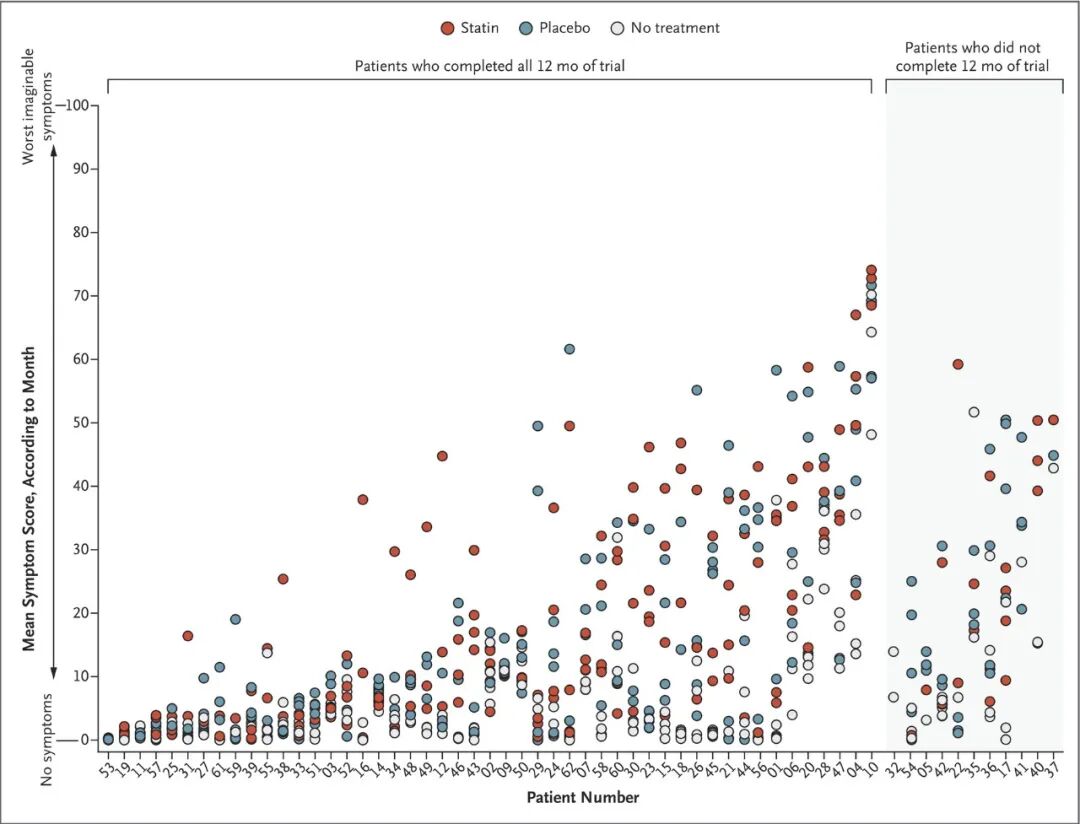 试验采用N比1设计,也就是说,每个患者都作为自己的对照。这些患者一共收到了12瓶药物,4瓶含有阿托伐他汀,4瓶含有安慰剂,4个空瓶。在持续一年的时间里,患者以每瓶对应一个月疗程来服药,顺序随机。同时,患者需要每天报告相关不良反应症状的程度(0-100分)。如果症状严重到患者无法耐受,当月可以停药。这种设计有助于反映临床用药的实际情况。