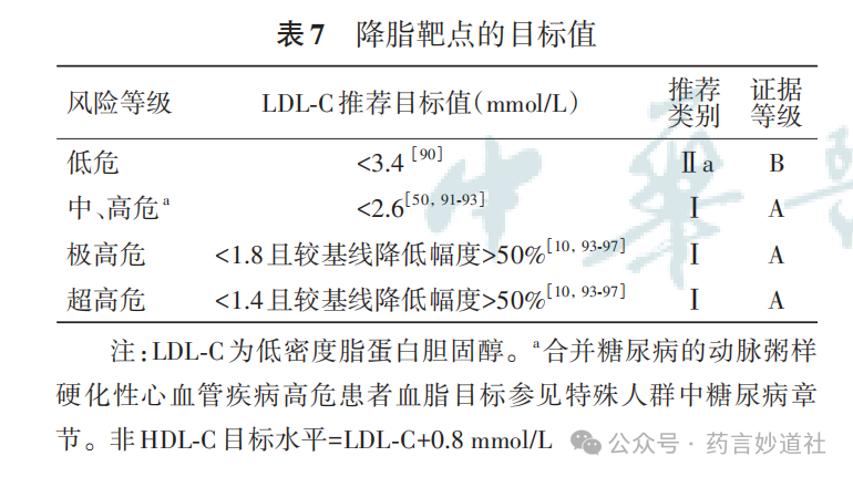 如治疗1~3 个月后,血脂仍未达到目标值,需及时调整降脂药物剂量或种类或联合应用不同作用机制的降脂药物。