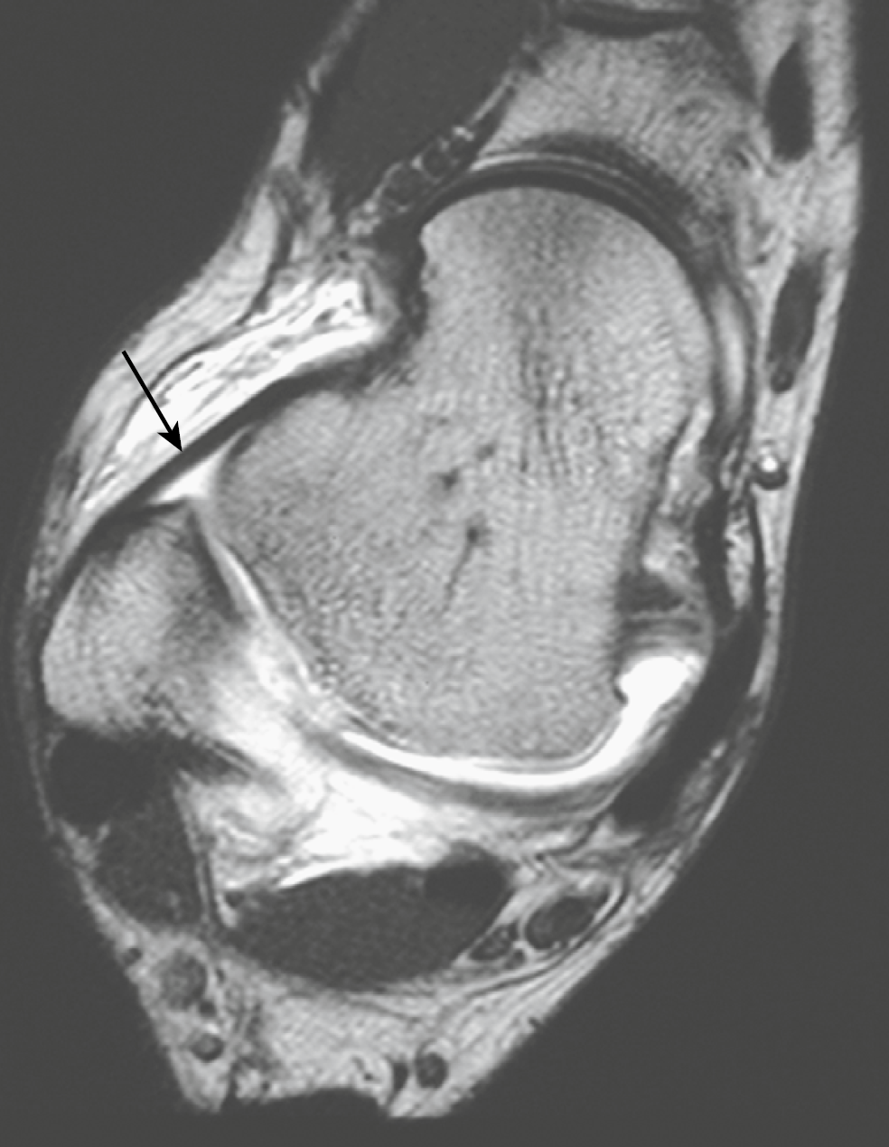 图1轴位T1加权的MR的关节造影图像:一个正常的、低信号强度距腓前韧带(箭头)